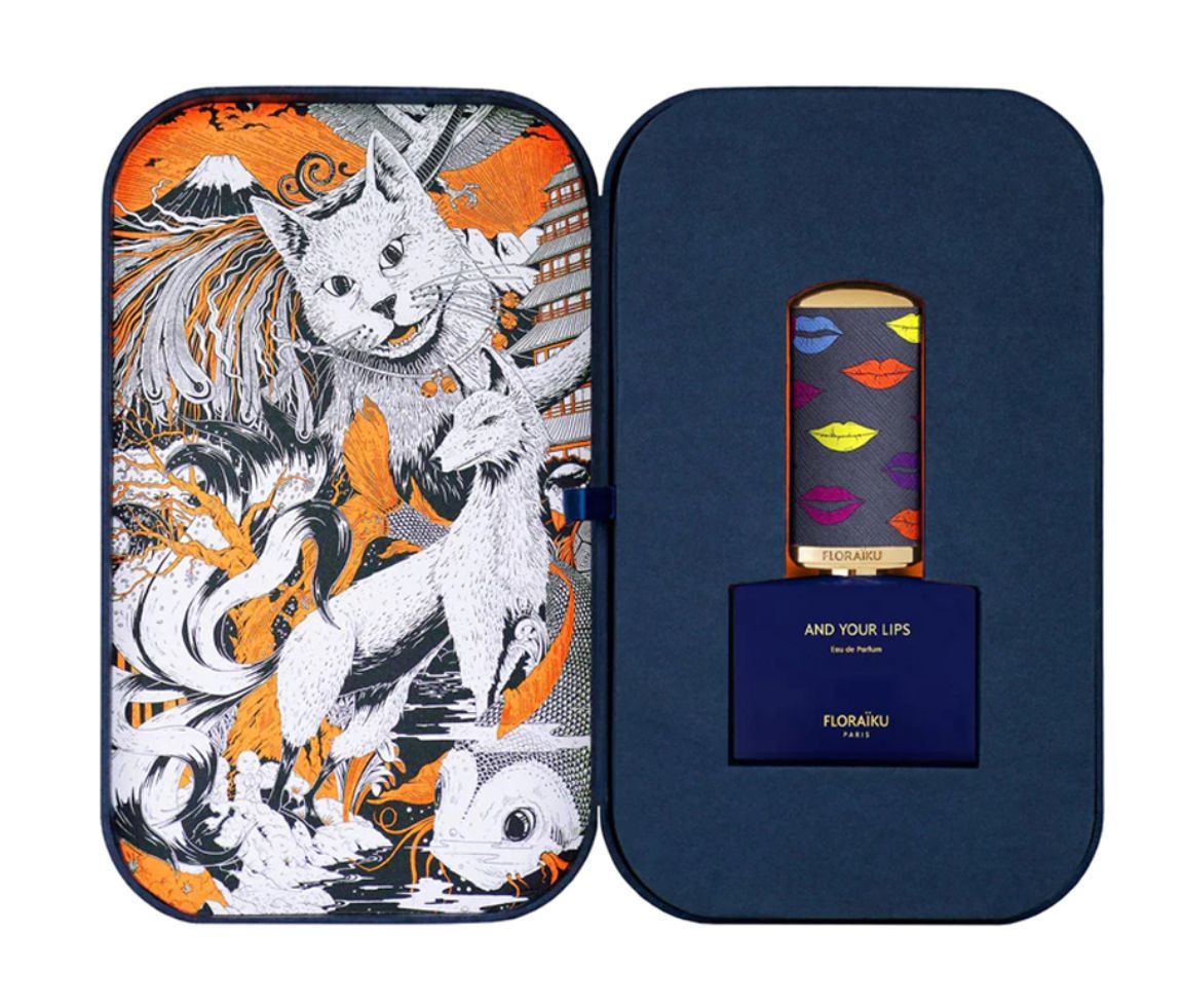 Парфюм Floraiku And Your Lips заключен в кобальтовый флакон с высоким колпачком, обтянутым голубой итальянской гранулированной кожей с изображением разноцветных губ. Чехол колпачка сшит вручную и может использоваться в качестве футляра для миниатюры-рефила объемом 10 мл.