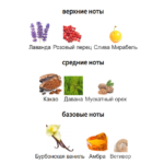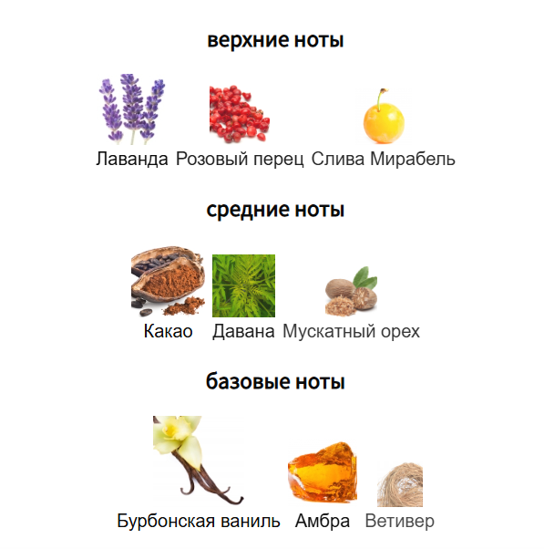 Композиция открывается ярким сочетанием сливы мирабель, розового перца и лаванды. Слива привносит сладкую фруктовую яркость, в то время как розовый перец добавляет слой пряностей. Лаванда завершает начало своим гладким, ароматным характером, создавая гостеприимное и изысканное вступление. Сердце аромата раскрывает мускатный орех, давану и какао. Мускатный орех вносит теплое, пряное звучание, уравновешенное травянисто-фруктовой сложностью даваны. Какао добавляет бархатистую текстуру, усиливая богатство композиции. Эти ноты образуют роскошный средний слой, который источает глубину и тепло.