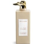 Флакон из атласного стекла выдержан в пудрово-бежевых оттенках и украшен скульптурной золотистой металлической крышкой, которая точно воспроизводит миниатюрную версию головы итальянской борзой левретки.